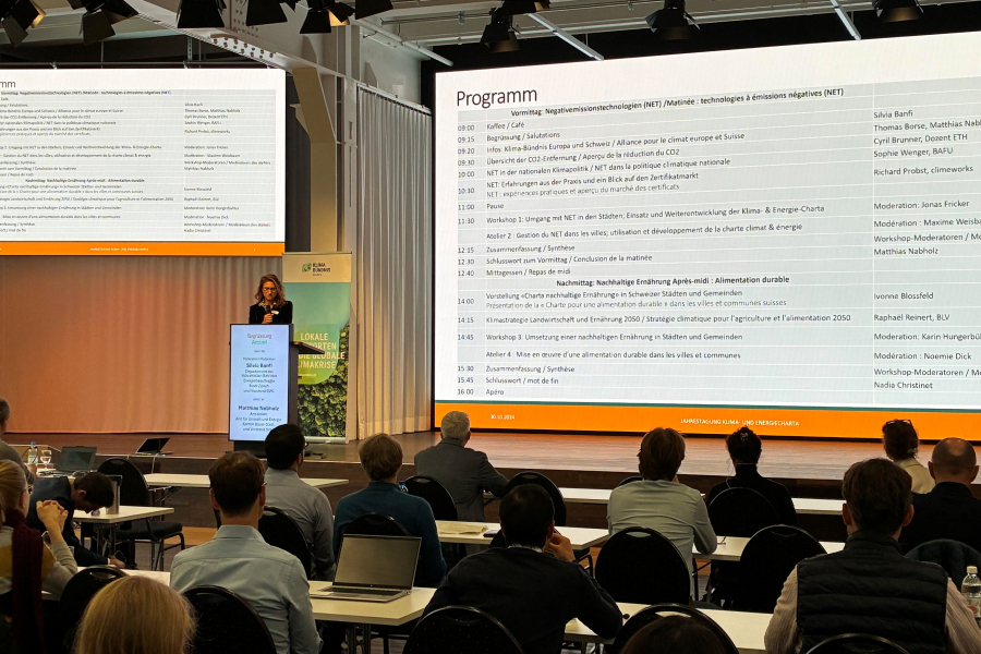 Den Auftakt zur Tagung gestaltete Thomas Brose, Geschäftsleiter KB-EU, mit einer Vorstellung des Klima-Bündnis Europa. Mathias Nabholz, Präsident KB-CH, seinerseits erläuterte das Engagement der Schweizer Städte und Gemeinden innerhalb dieses Netzwerks. Danach stand der Vormittag ganz im Zeichen der Negativemissionstechnologien (NET). Cyril Brunner von der ETH Zürich machte deutlich, dass für Netto-Null die Emissionsreduktion zwar zentral ist, die CO2-Entfernung aber unverzichtbar bleibt. Er stellte ein breites Portfolio an Methoden zur CO2-Entfernung vor und diskutierte, welche für die Schweiz voraussichtlich relevant sein werden (z.B. Bioenergie mit CO2-Abscheidung und -Speicherung BECCS). Eine der grossen Herausforderungen wird es sein, diese Methoden rechtzeitig auf den erforderlichen Massstab zu bringen. Einblicke in die nationale Klimapolitik und die Entwicklung der rechtlichen Rahmenbedingungen gab Sophie Wenger vom BAFU. Sie betonte, dass Städte und Gemeinden eine wichtige Rolle bei der Anwendung von NET spielen und sie sich dabei an der nationalen Klimapolitik, insb. dem KIG, orientieren können. Schliesslich präsentierte Luca Christen von Climeworks die Direct-Air-Capture-Technologie seines Unternehmens, mit der CO₂ direkt aus der Luft gefiltert und dauerhaft im Boden gespeichert wird.